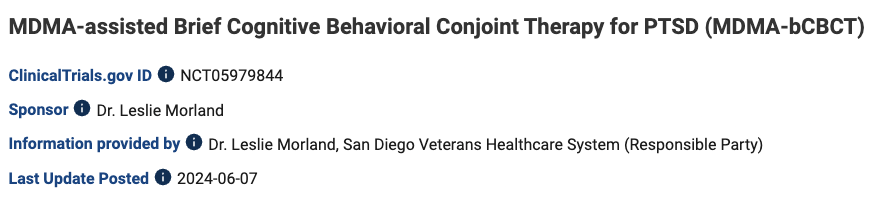 The VA currently has an FDA-approved Phase 3 study in progress called "MDMA-assisted Brief Cognitive Behavioral Conjoint Therapy for PTSD (MDMA-bCBCT)" with results expected at the end of 2024. This study is described as "An open label, single site study assessing the preliminary effectiveness, safety, and acceptability of an intervention consisting of MDMA-assisted bCBCT".