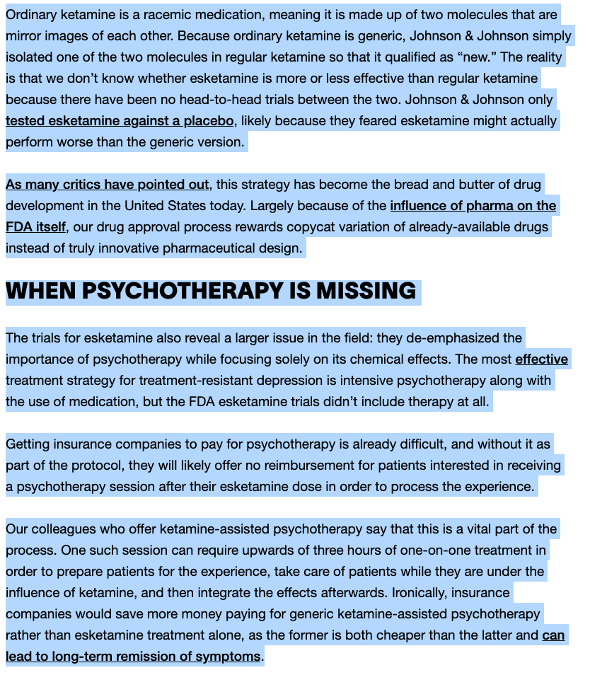 Whether psychiatric drugs or psychedelic medicines are added to your mental health care plan, a licensed psychotherapist is meant to support you in going on to lead a life without reliance on a daily drug treatment, an approach dominated by the psychiatry movement and pharmaceutical corporations advertising directly to "consumers" since the mid 1980's. Media reports warn of unscrupulous ketamine clinics marketing directly to consumers next to banner ads for Johnson & Johnson's Spravato.