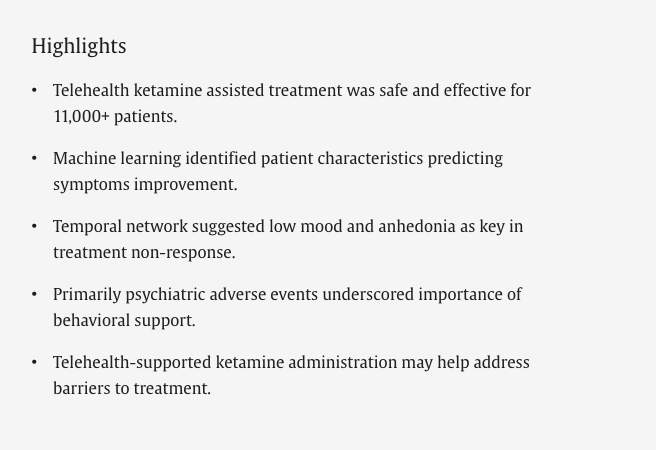 This research was expanded in a longitudinal study by Mathai, et al, 2024 "At-home, telehealth-supported ketamine treatment for depression: Findings from longitudinal, machine learning and symptom network analysis of real-world data”.