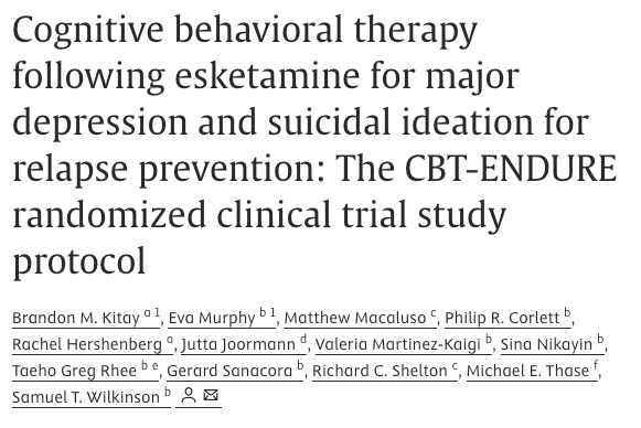 In 2023, researchers compared the esketamine part of the ketamine molecule with and without cognitive behavioral therapy in "Cognitive behavioral therapy following esketamine for major depression and suicidal ideation for relapse prevention: The CBT-ENDURE randomized clinical trial study protocol (Kitay, et al, 2023) writing:
